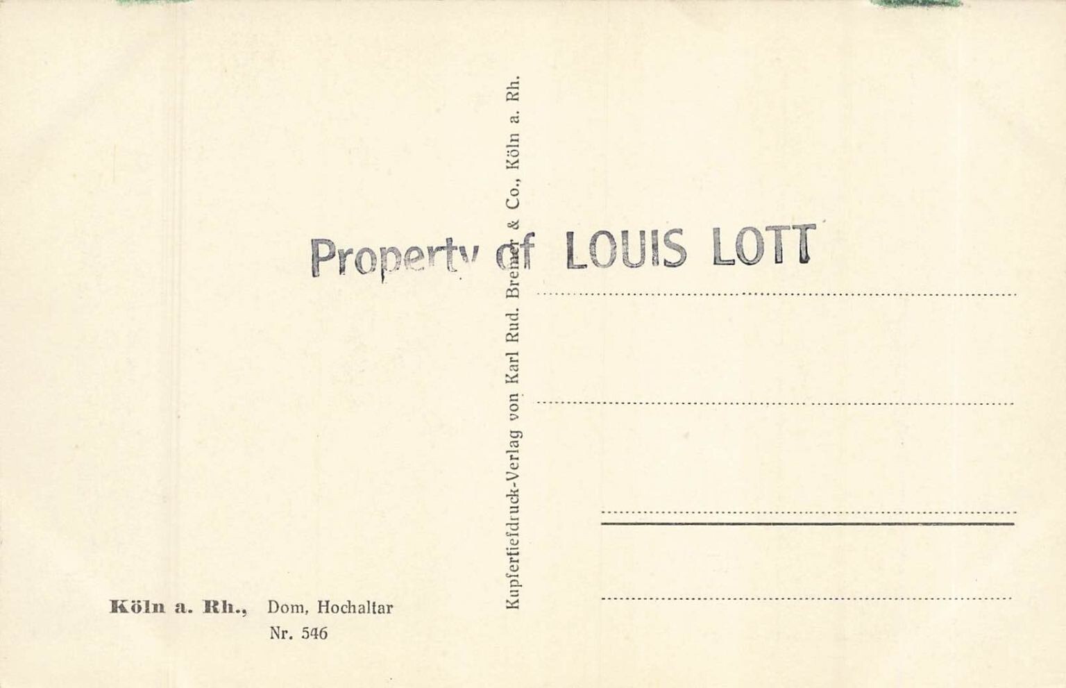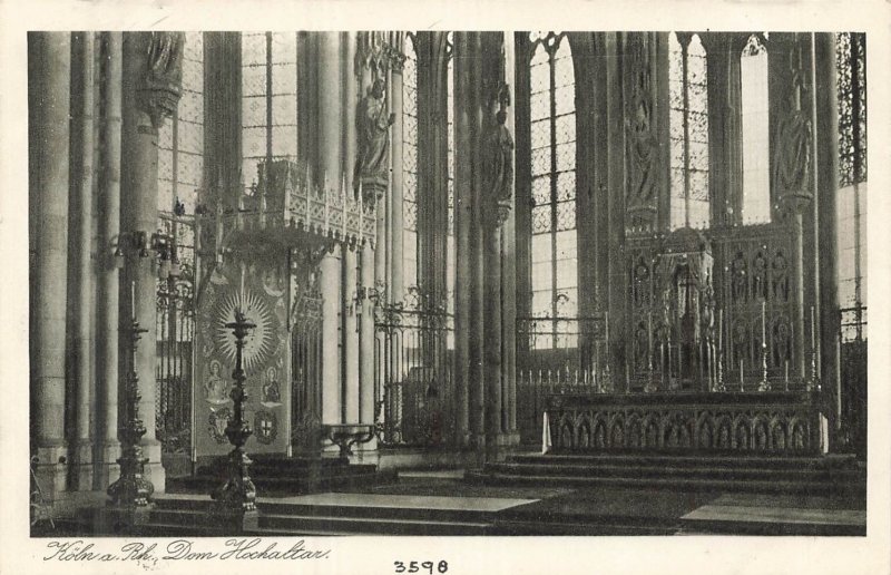 This vintage postcard captures a detailed black and white image of the High Altar inside the Köln Cathedral (Kölner Dom), one of Germany's most iconic Gothic landmarks. The postcard shows the intricate architecture, stained glass windows, and religious statues that adorn the altar area, showcasing the grandeur and historic significance of this sacred site. The composition highlights the impressive ironwork and sculptural elements characteristic of the cathedral's interior.Produced by the reputable German publisher Karl Rud. Brennf. & Co., Köln a. Rh., this postcard is a standard size (approximately 5.5 x 3.5 inches) typical of early to mid-20th century European postcards. The card is a printed halftone image on matte cardstock, an example of period postcard printing techniques. The reverse features a divided back with space for message and address, marked "Köln a. Rh., Dom, Hochaltar Nr. 546," indicating its place in a numbered series. This collectible postcard is unposted and retains clear legibility, making it a valuable piece for collectors interested in historic European cathedrals or vintage German postcards.