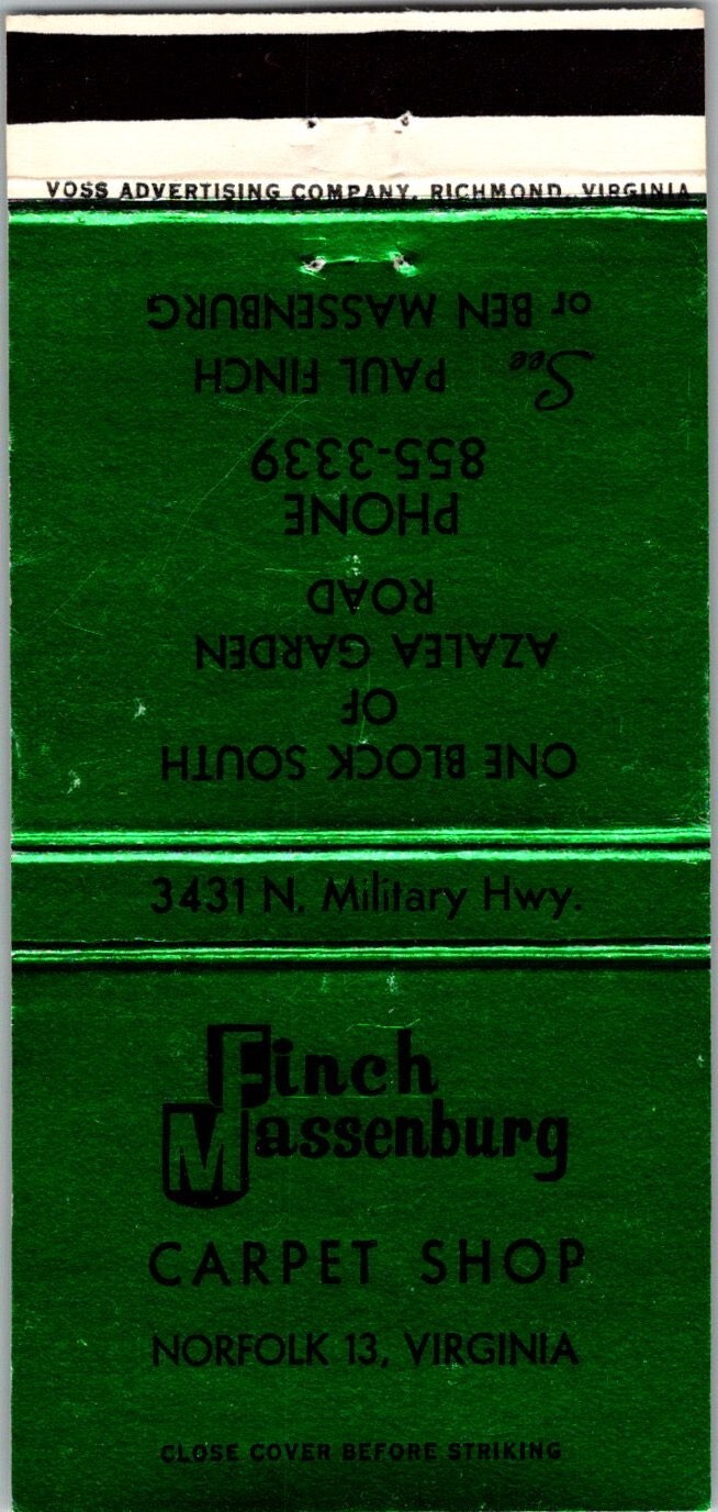 Vintage Matchbook Cover Finch Massenburg Carpet Shop Norfolk, Virginia MB142