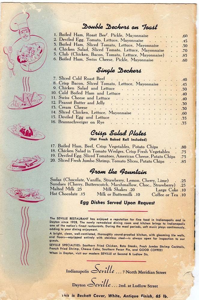 Item: Vintage menu (1940's?) - Seville Restaurant - Indianapolis & Dayton. Check out those prices! Inside is blank - I'm guessing they attached the dinner special to the inside). Lunch menu on back. Fair condition ( ... Read More