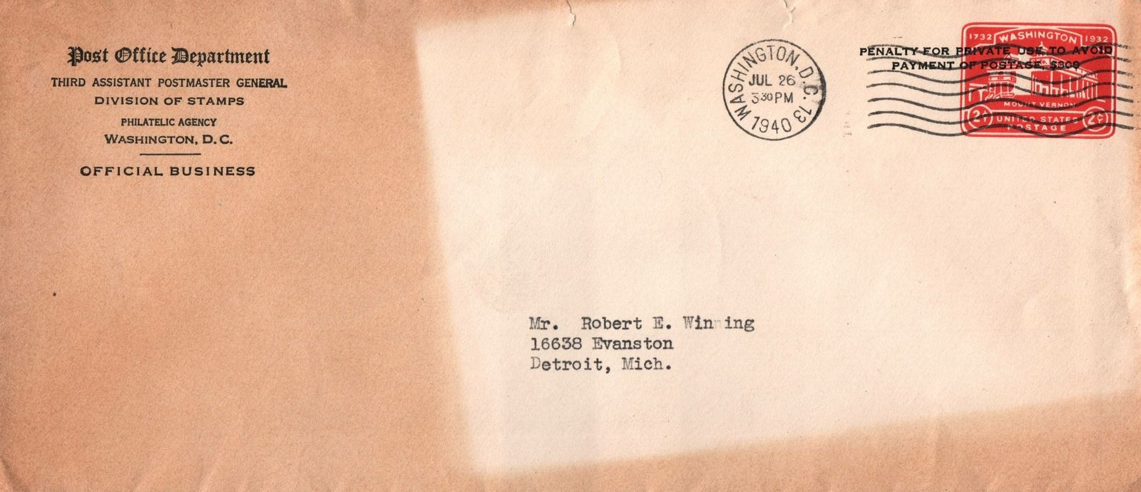 VINTAGE OFFICIAL STATIONERY OFFICIAL BUSINESS THIRD ASSISTANT POSTMASTER GENERAL