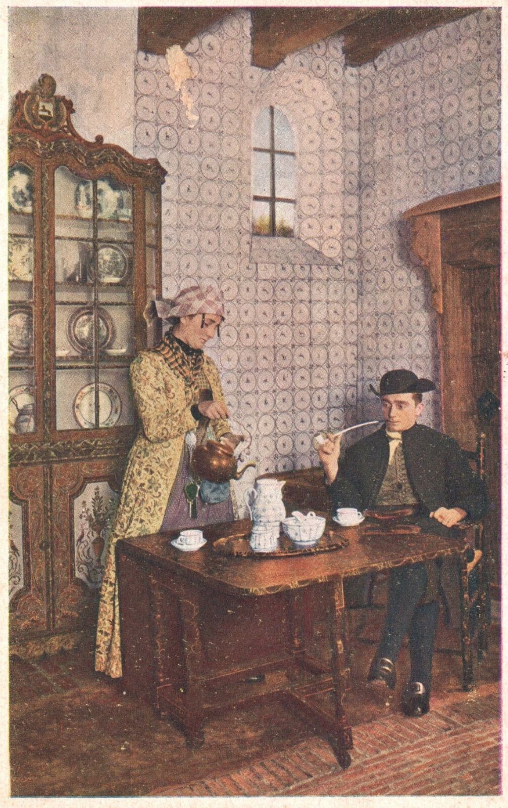 Vintage postcard 1920's hindeloopen hindelooper kamer serving tea white teapot