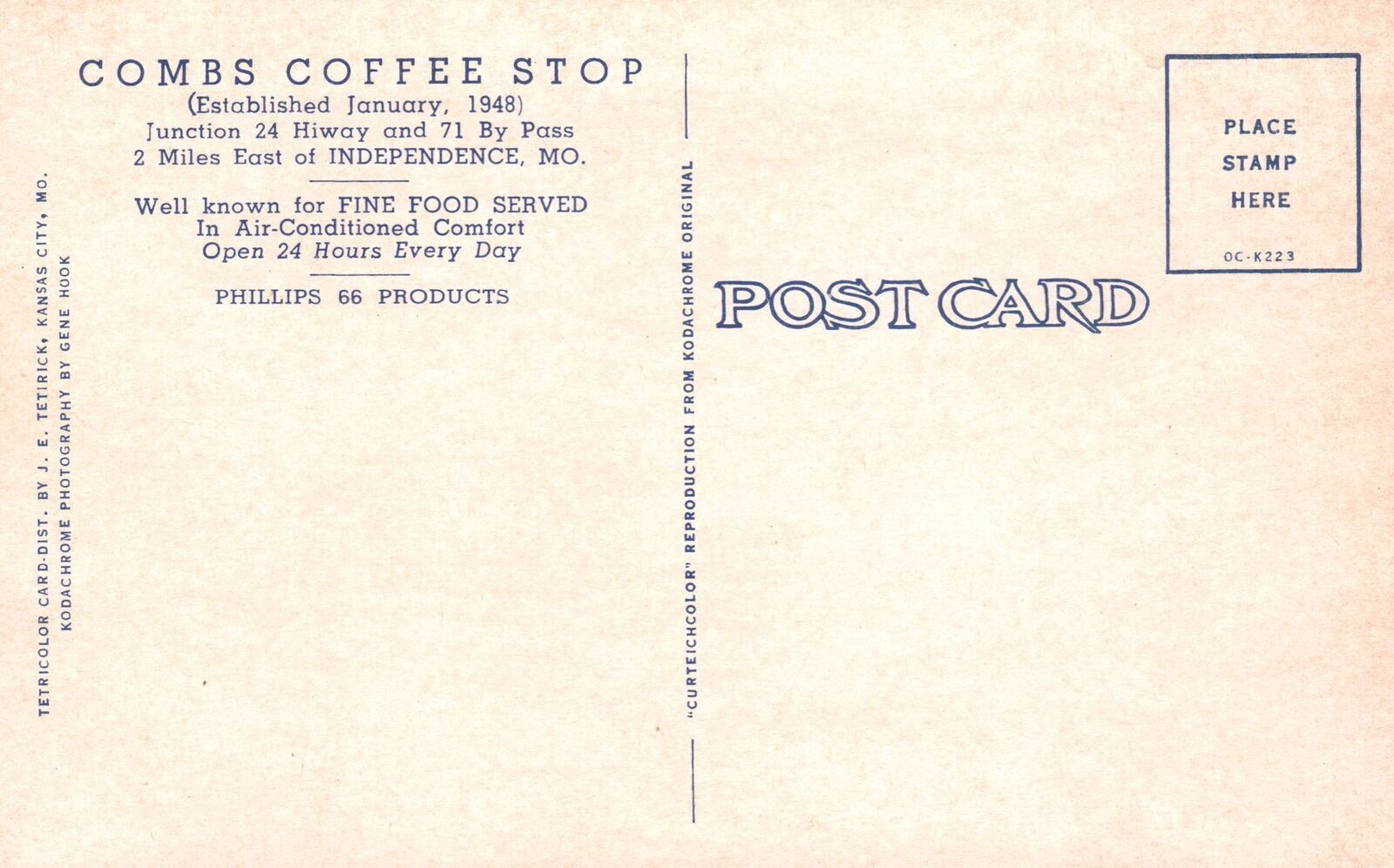 Vintage Postcard Combs Coffee Stop Fine Food East Independence Missouri J.E.T.