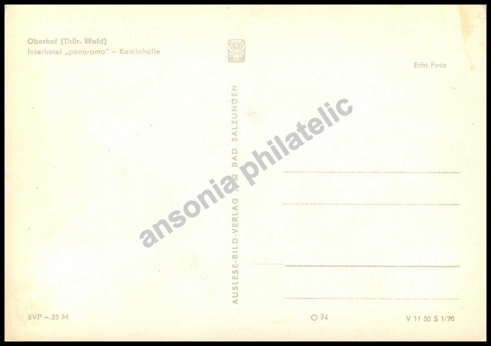 Some scans of postcards result in colored streaks which are a result of the error in scanning and not a fault of the postcard.