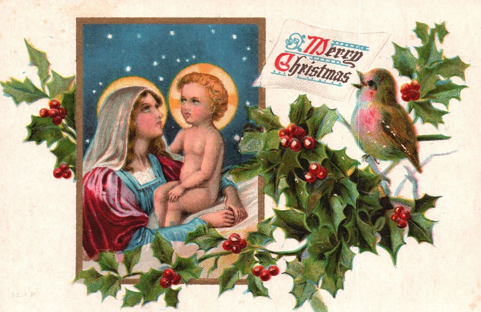 Vintage Postcard Merry Christmas Mary & Baby Jesus Bird Leaf Yuletide Greetings
