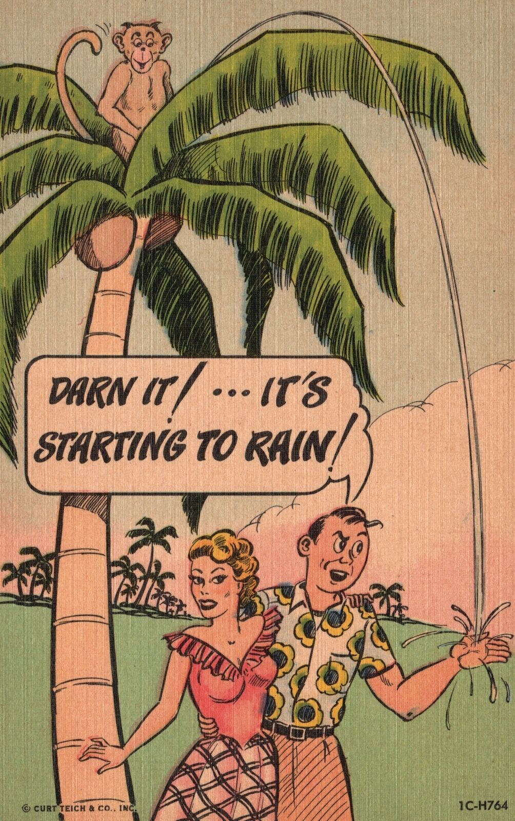Vintage Postcard Monkey On Coconut Tree Peed On Couple It's Starting To Rain