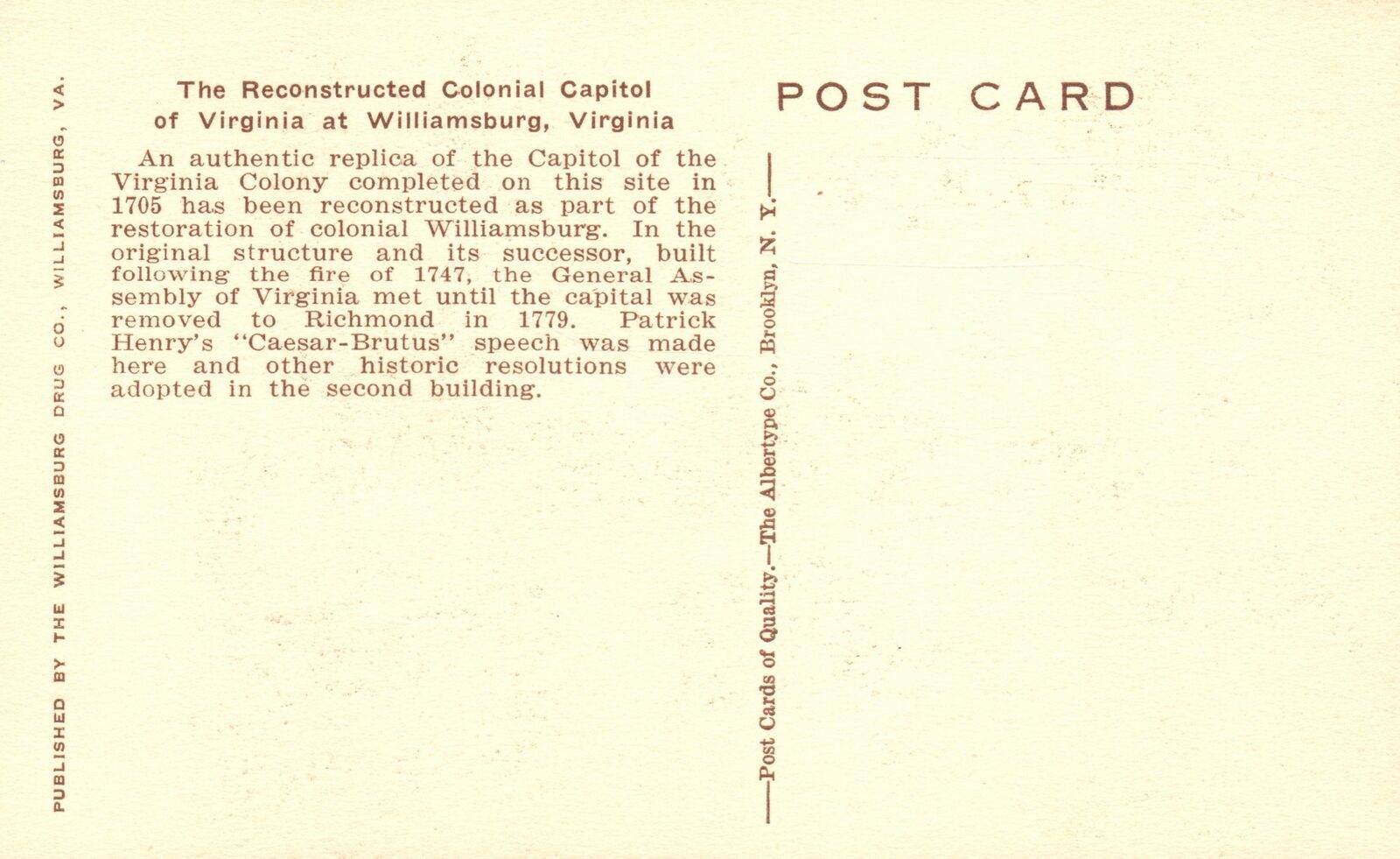Vintage postcard reconstructed colonial capitol authentic replica williamsburg