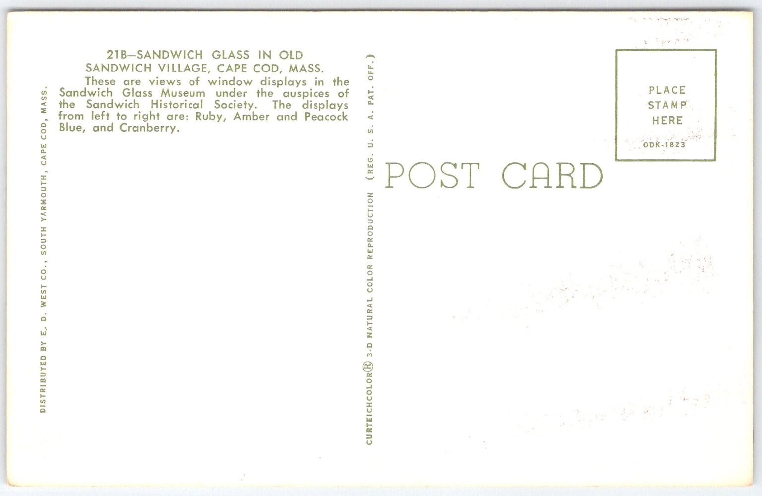 This vintage postcard features a colorful window display from the Sandwich Glass Museum located in old Sandwich Village, Cape Cod, Massachusetts. The image captures the vibrant and intricate beauty of ruby, amber, peacock blue, and cranberry colored glass pieces arranged on shelves before a large window, showcasing the exquisite craftsmanship of traditional Sandwich glass. The postcard is a nostalgic glimpse into the historic glassmaking heritage of Cape Cod, celebrated by the Sandwich Historical Society.Produced by the E.D. West Co. of South Yarmouth, Cape Cod, this postcard is printed with 3-D natural color reproduction by Curt Teich, a renowned publisher of mid-20th century postcards. The standard size (5.5 x 3.5 inches) and clear captioning make it a perfect collectible for lovers of Americana, glass art, and New England history. Its depiction of a museum display highlights the cultural significance of Sandwich glass and the local craftsmanship that has been treasured for generations.