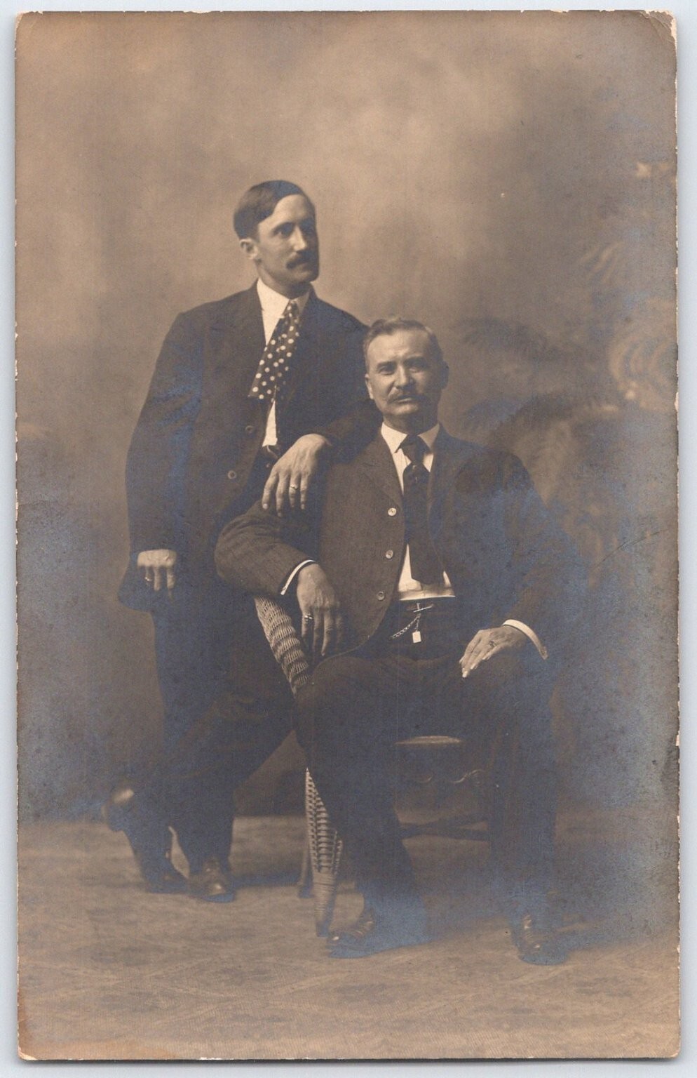 This vintage postcard features a sepia-toned studio portrait of two men dressed in early 20th-century formal attire. The seated gentleman sports a three-piece suit with a pocket watch chain, while the standing man w ... Read More