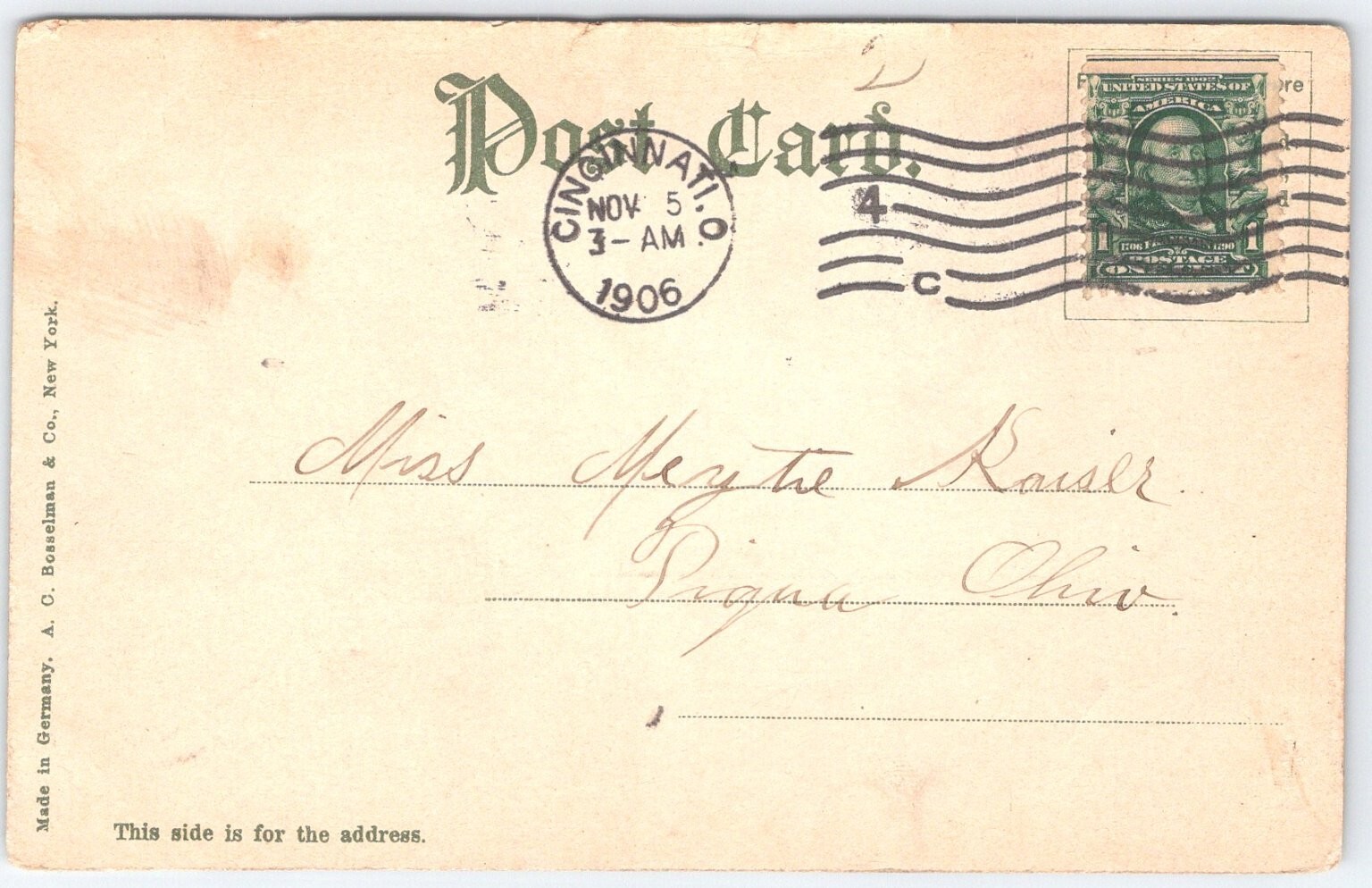 This vintage postcard features a beautifully colored image of the Tyler-Davidson Fountain, a historic landmark located in Cincinnati, Ohio. The fountain is prominently displayed with its intricate statues and flowing water, surrounded by lush trees and early 20th-century architecture. The postcard captures a lively street scene with pedestrians and storefront awnings, offering a nostalgic glimpse into Cincinnati's past.Printed in Germany by A. C. Bosselman & Co., New York, this postcard dates back to 1906 as indicated by the Cincinnati postmark and the one-cent stamp featuring George Washington. The card is a standard size of approximately 5.5 x 3.5 inches, typical of postcards from this era. Collectors and history enthusiasts will appreciate the postcard's depiction of the Tyler-Davidson Fountain, an important cultural icon in Cincinnati, as well as its original mailed status, adding to its authenticity and collectible value.