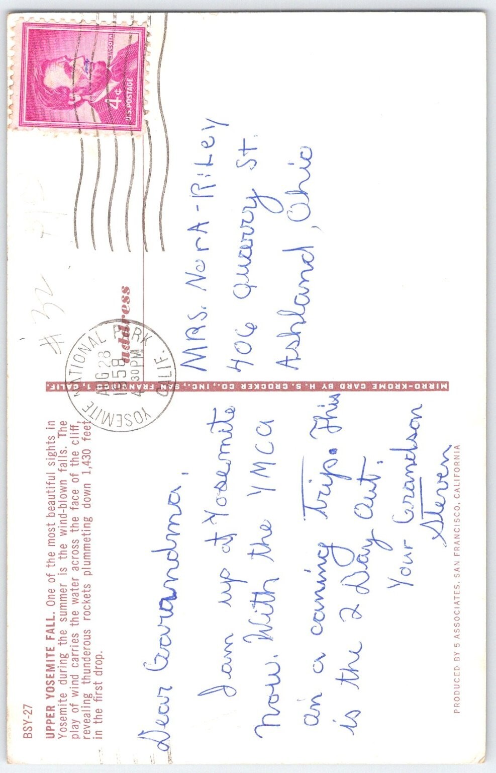 This vintage postcard captures the breathtaking Upper Yosemite Fall, one of the most iconic natural landmarks in Yosemite National Park, California. The image showcases the powerful waterfall plunging 1,430 feet, surrounded by rugged cliffs and lush greenery, with mist rising from the thunderous drop. The postcard uses a classic linen finish, popular in mid-20th century postcard production, which enhances the texture and vibrant colors of the scenic landscape.Produced by 5 Associates, San Francisco, this original postcard is a perfect collectible for nature lovers and fans of national park memorabilia. The back of the card includes a handwritten message and a clear postmark dated August 28, 1958, adding historical value and a personal touch to this charming piece. The standard size of 5.5 x 3.5 inches makes it ideal for framing or display. This postcard celebrates the natural beauty and heritage of one of America's most treasured parks.