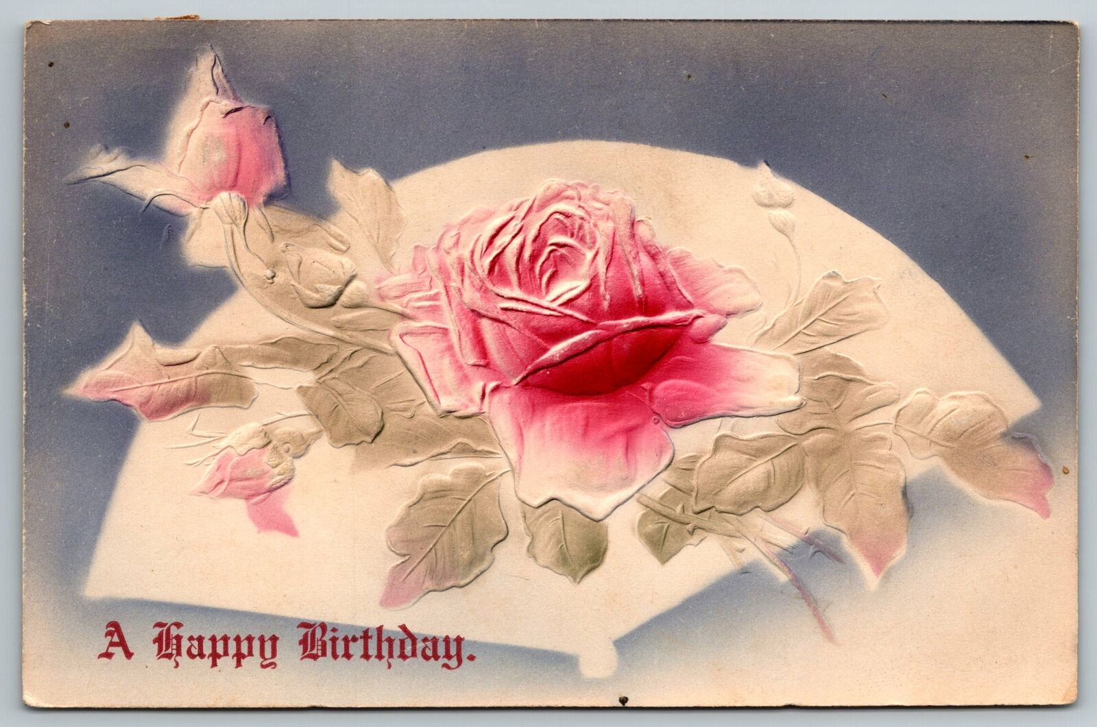 Vintage Victorian Flowers~Pale Pink Roses~Ladies Fan~c1910 Embossed Airbrushed