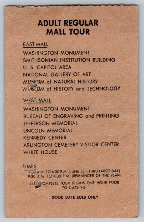 VINTAGE WASHINGTON DC TOURMOBILE ADULT TICKET*GLOBE TICKET CO*MALL TOUR