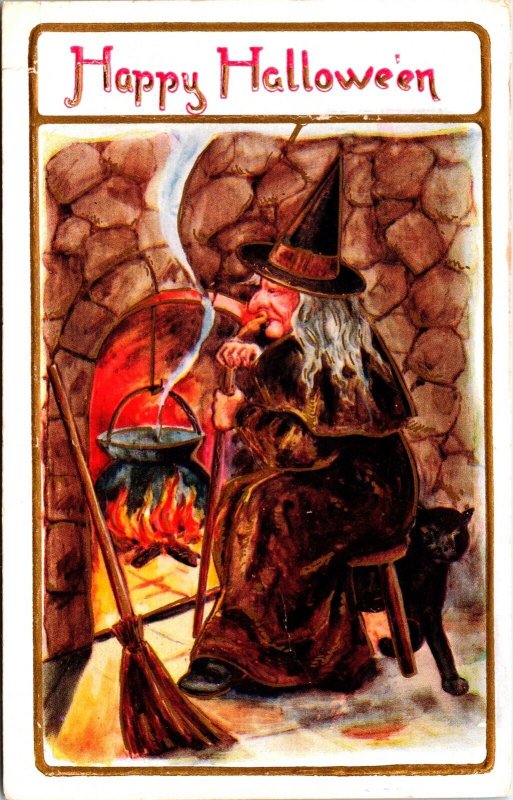 Vintage Witch, Broom, Hat, Boiling, Cauldron,Fireplace,Spell, Halloween Postcard