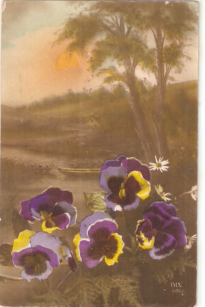 ""Violet Flowers in landscape" Nice vintage postcard