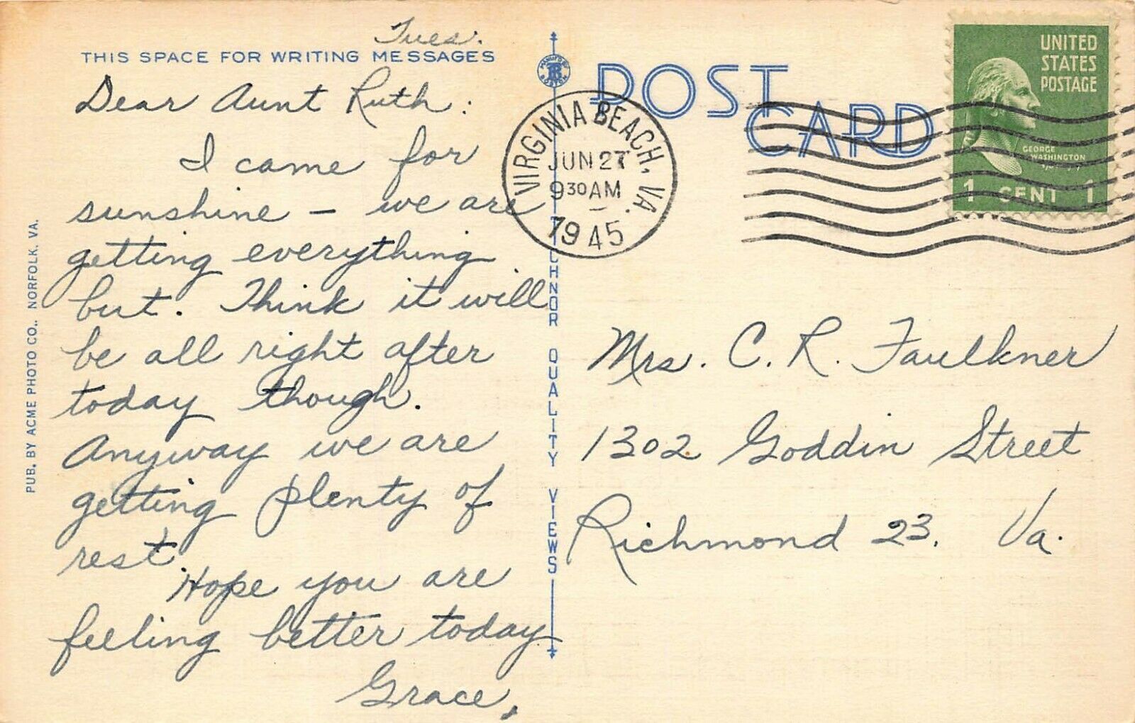VIRGINIA BEACH VA~AERIAL VIEW NORTH ~1945 PMK POSTCARD