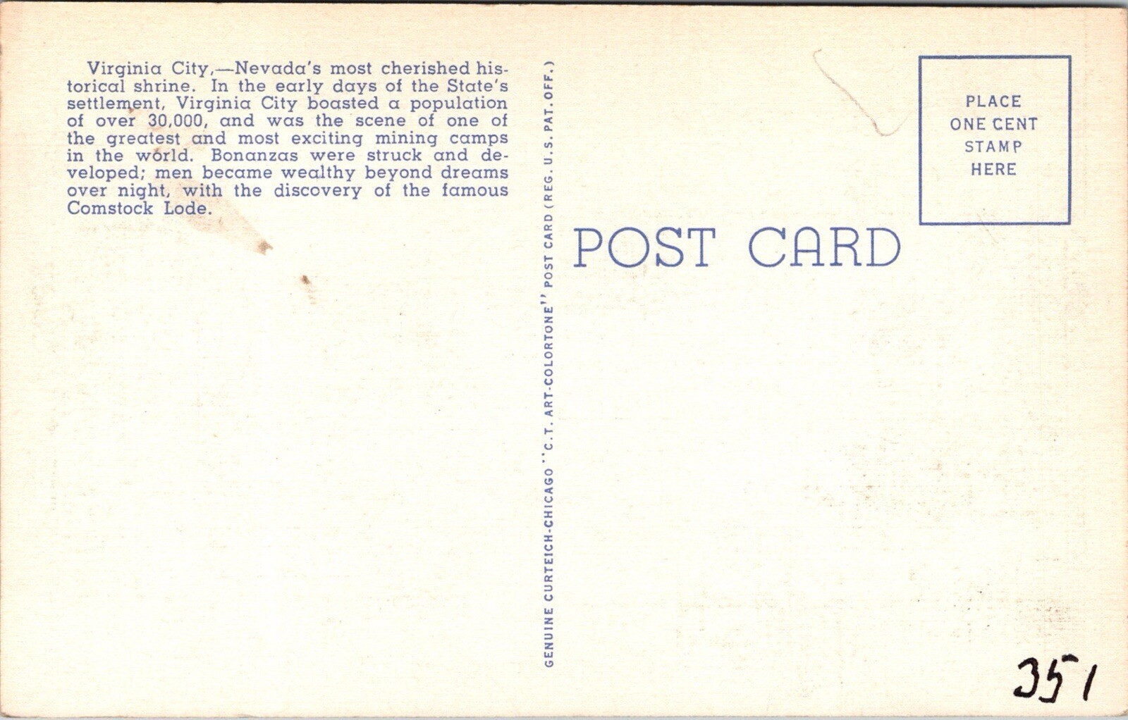 This vintage postcard features the beautiful city of Virginia City, Nevada. The postcard is made of high-quality linen and has not been posted. It is a great addition to any collection of postcards or a perfect souv ... Read More