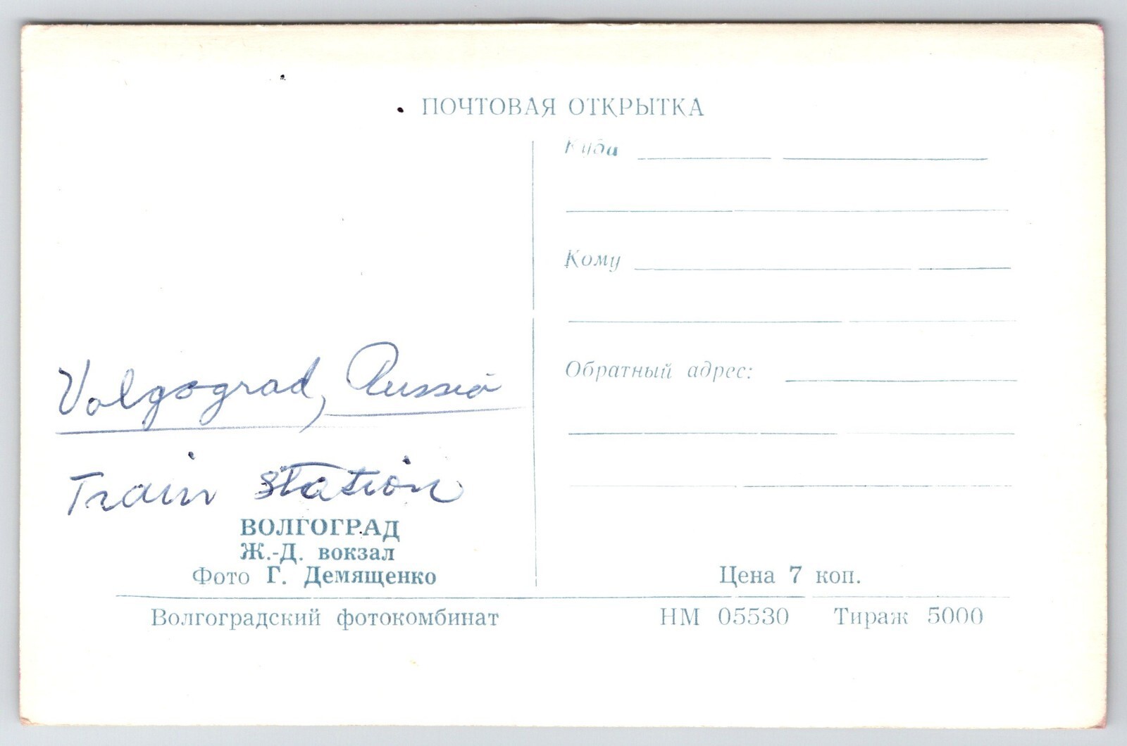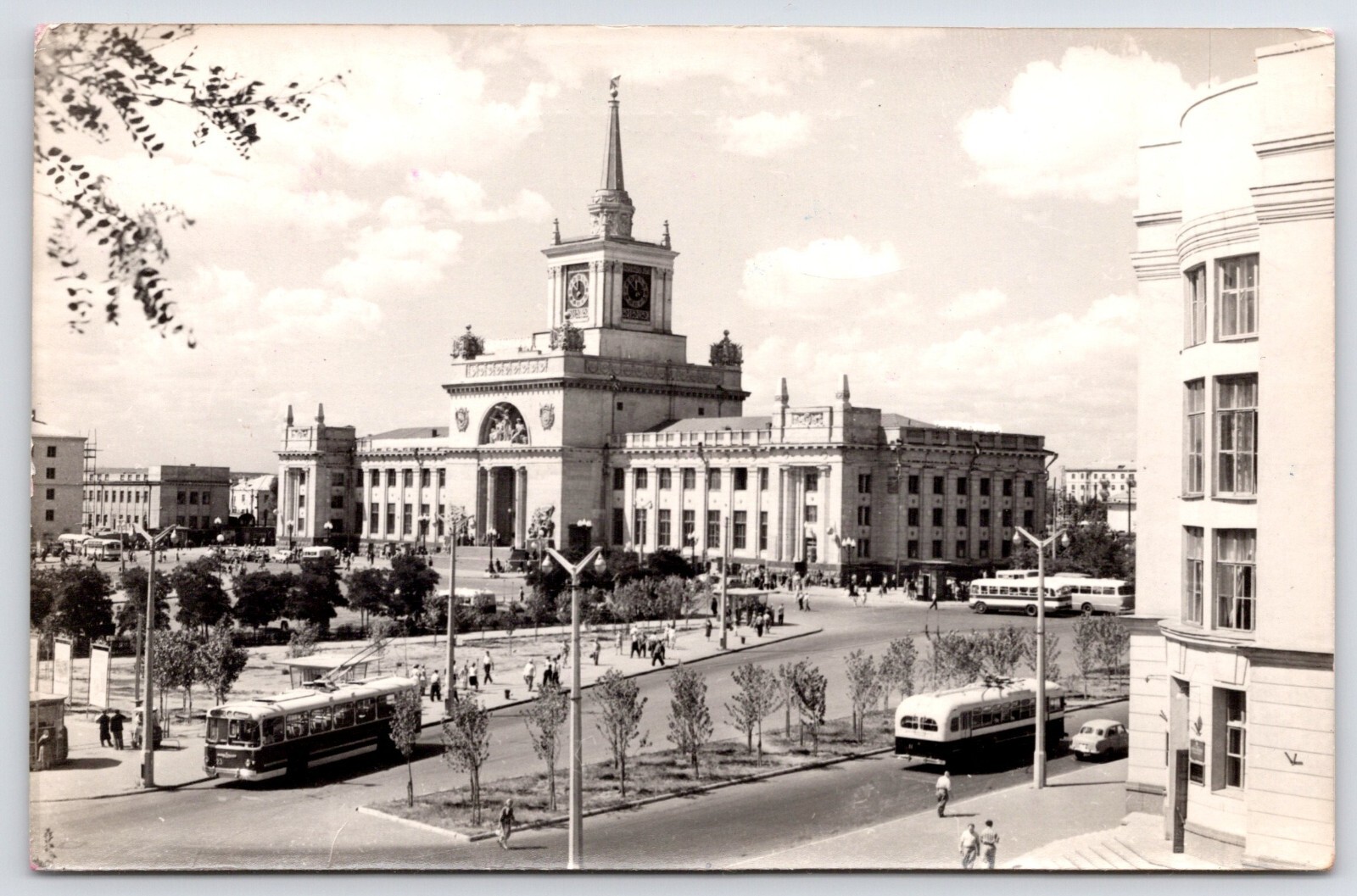 Volgograd~Cold War USSR Train Station Clocktower~Buses~вокзал~Demyashenko~RPPC