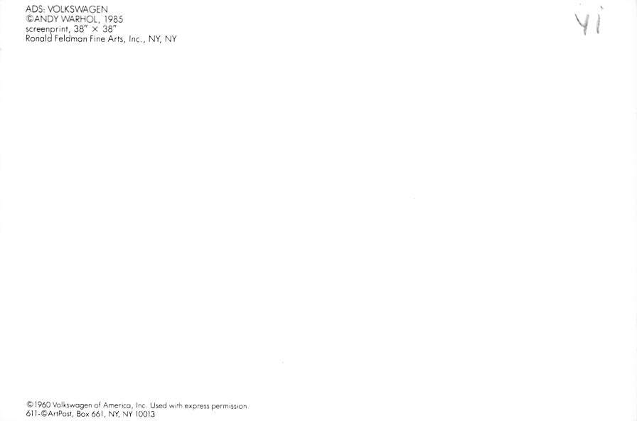 Volkswagen, Ronalds Feldmon Fine Arts Postcard Grade: 1 Size: Continental Size - approximatly 4 Inch x 6 Inch (15 cm x 10.5) Grading Scale: Grade 1 = Perfect corners Grade 2 = Very Minimal corner wear, no crea ... Read More