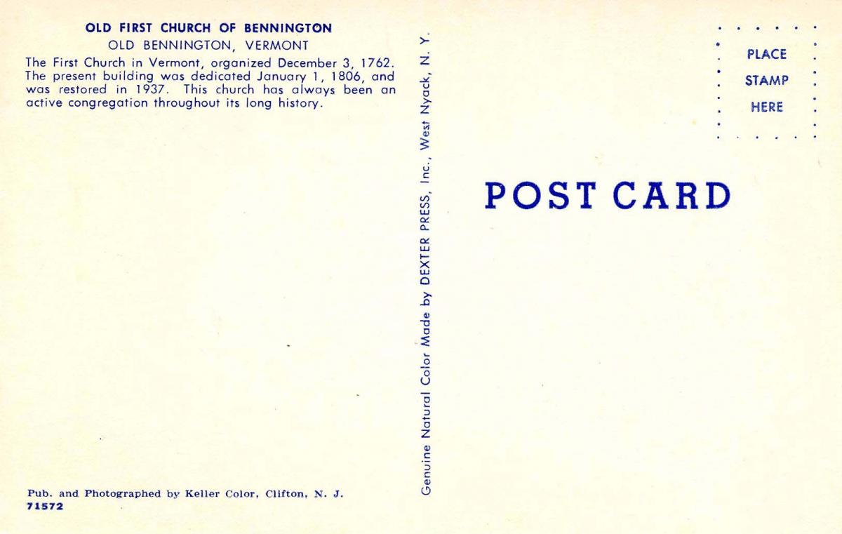 VT - Bennington. Old First Church, Exterior E, Un, Db, C Grading of Postcards MINT (M): Perfect condition, no apparent blemishes, flaws, postally unused, may have some writing on back. NEAR MINT (NM): Like new, im ... Read More