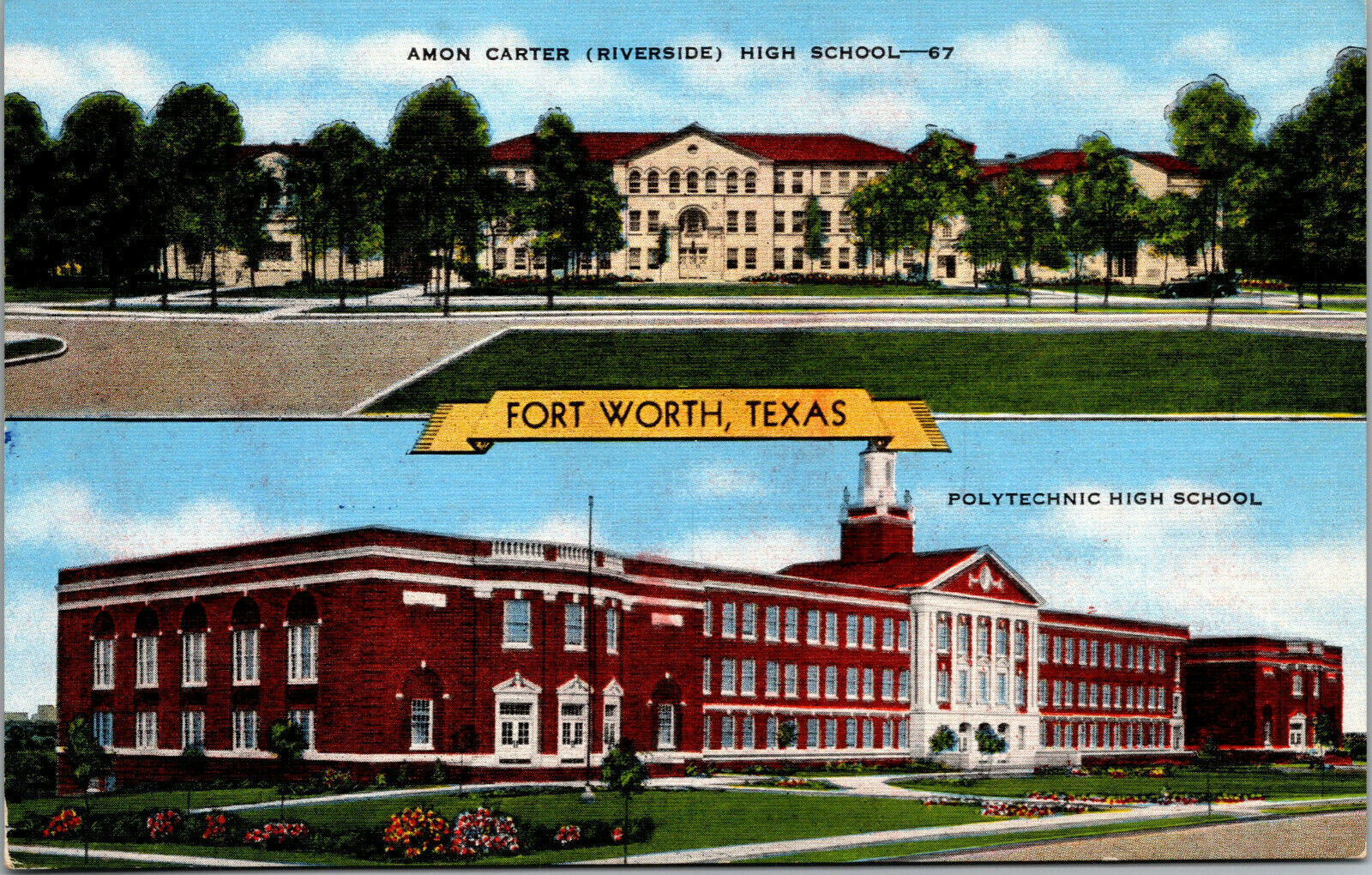 Vtg Fort Worth TX Amon Carter Riverside & Polytechnic High Schools Postcard