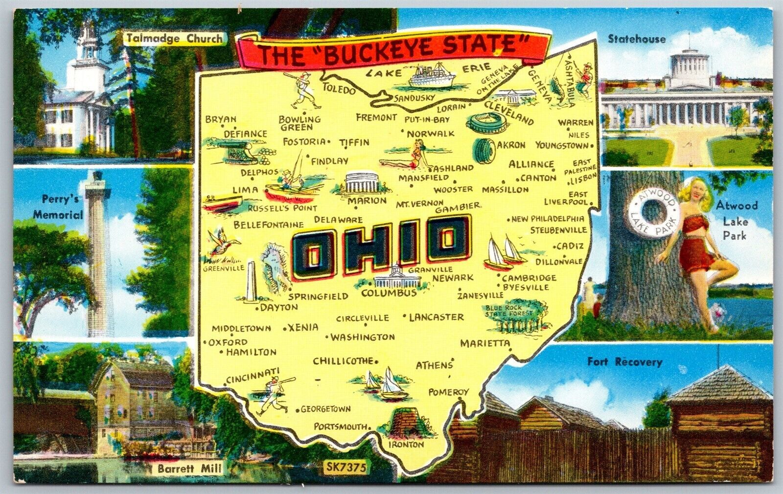 Vtg Ohio OH State Map Illustrated Cities Things To Do 1950s Chrome Postcard