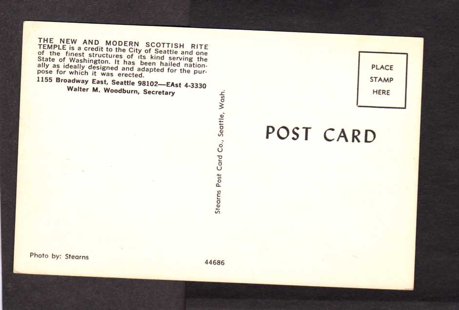 WA View of Scottish Rite Freemasonry Temple in SEATTLE WASHINGTON Postcard, Mason, Masonry PC. Walter M. Woodburn, Secretary. Lot Details This is a Standard sized postcard (3 1/2" by 5 1/2") with some corner and ed ... Read More