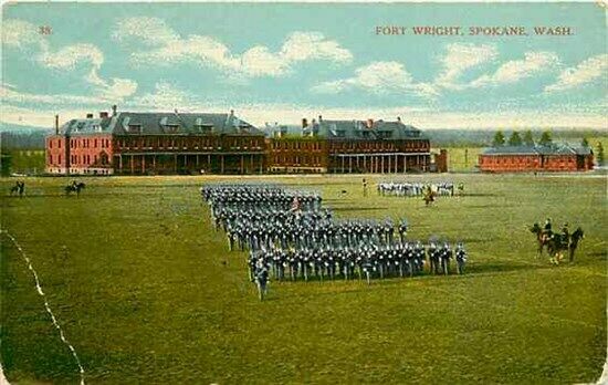 Spokane, Washington, Fort Wright, Parade Grounds Early Printed Postcard. Publisher: Spokane Post Card Co # 38 The corners have heavy wear. Crease at left corner. The image is nice and clean. Postally used.