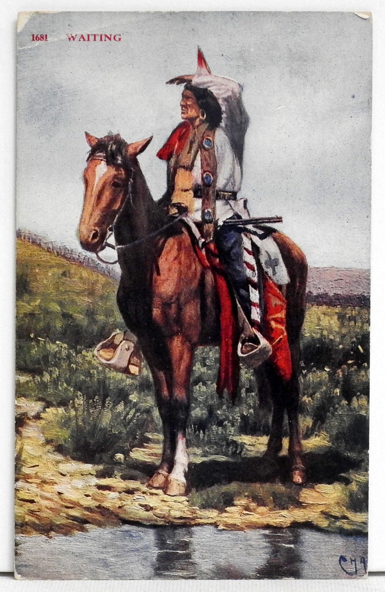 Antique Lithograph Postcard; Native-American; American Indian; Horse and Rider; Postmarked in 1914; Addressed to Los Angeles, California; Soiled, creased corner, wear to edges and corners;Seller Information