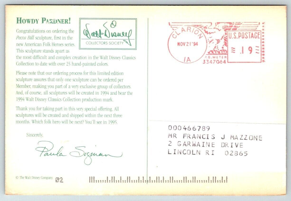 Walt Disney Pecos Bill Sculpture Postcard