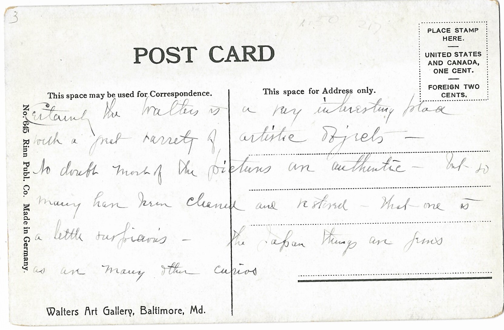 Walters Art Gallery Baltimore Maryland. Some corner wear, never mailed but writing on back side