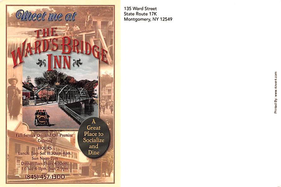 Ward's Bridge Inn - Montgomery, New York Grade: 1 Category: Continental Size Postcard, Approx 4 in x 6 in (10 cm x 15.25 cm) Product Size: Continental size: 4X6 inches (10.5 cm x 15 cm) Grading Scale: Grade 1 ... Read More