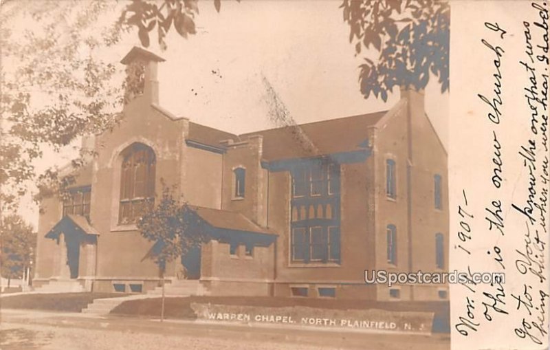 Warren Chapel in North Plainfield, New Jersey Postcard - 1907 Grade: 1 Size: R - Regular size: Approx 3 1/2 X 5 1/2 inch (9 cm X 14 cm) Grading Scale: Grade 1 = Perfect corners Grade 2 = Very Minimal corner we ... Read More