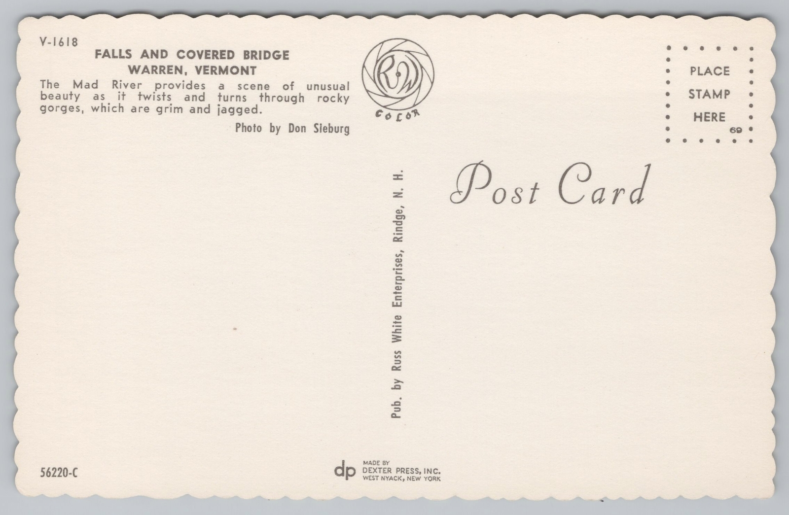 Warren Vermont~Falls & Covered Bridge~Mad River~Vintage Postcard