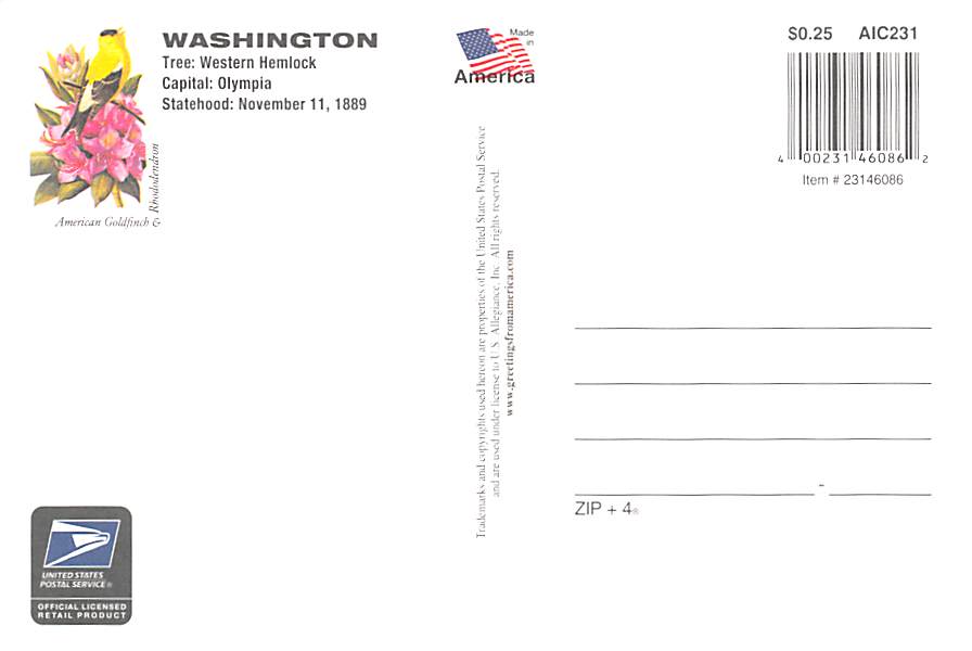 Washington - Grade: 1 Category: Continental Size Postcard, Approx 4 in x 6 in (10 cm x 15.25 cm) Product Size: Continental size: 4X6 inches (10.5 cm x 15 cm) Grading Scale: Grade 1 = Perfect corners Grade 2 = V ... Read More
