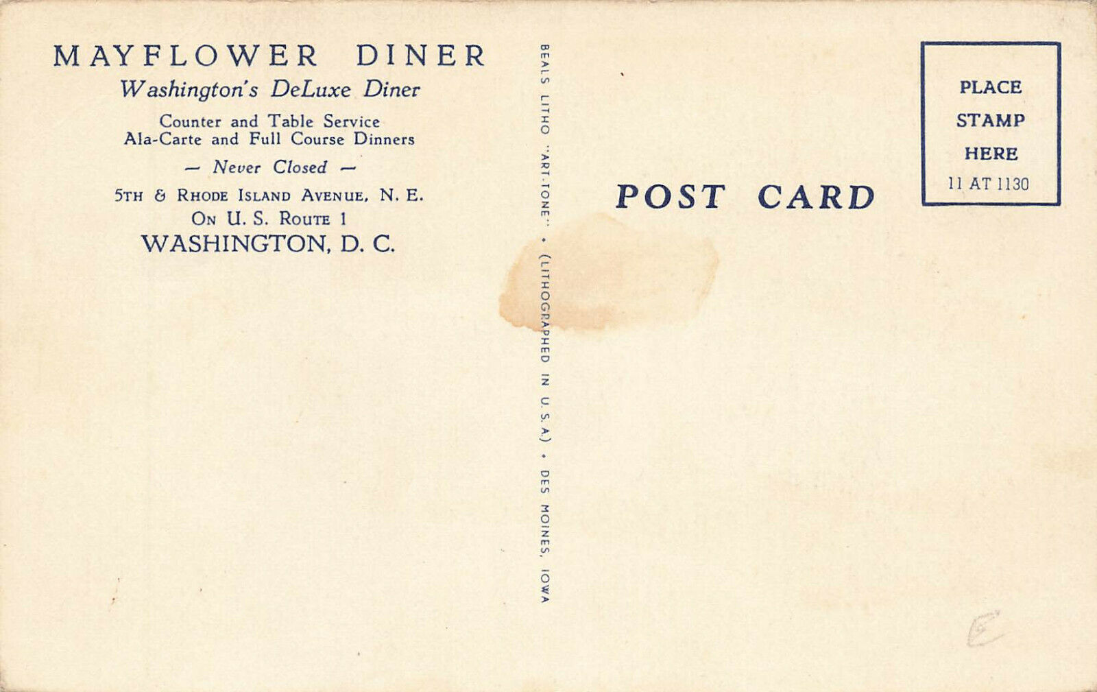 Condition: Used Washington DC "Mayflower Diner" 1950 Linen Postcard. If you buy more than one item 'buy it now' Please use the 'add to basket' function as this will activate the combined shipping rate. For more ... Read More