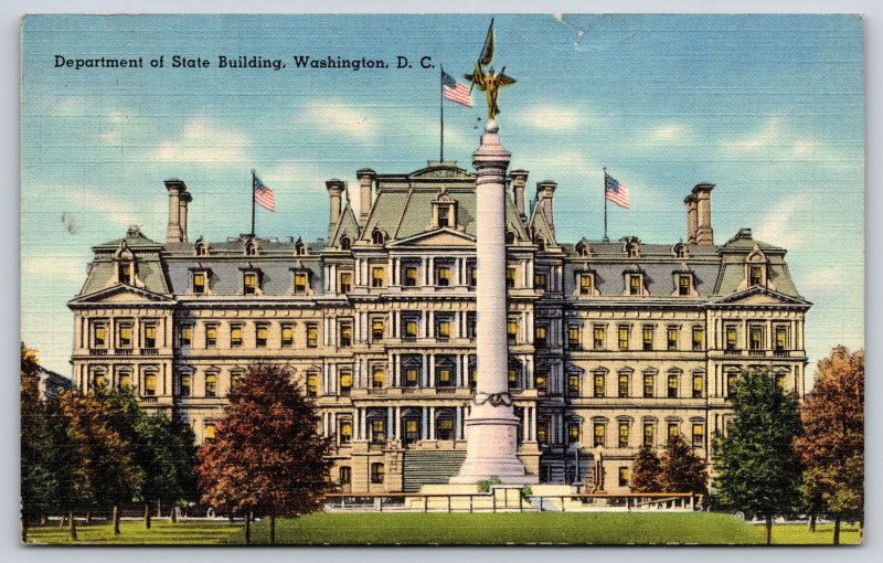 Washington DC~Dept State Bldg~Statue~Flags~French 2nd Empire~Linen 1942 Postcard