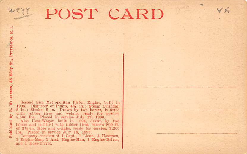 Washington Engine Providence RI USA Postcard, Grade: 1 Size: Regular Size Postcard - approximately 3 1/2 inch x 5 1/2 inch (9 CM x 14 CM) Grading Scale: Grade 1 = Perfect corners Grade 2 = Very Minimal corner w ... Read More