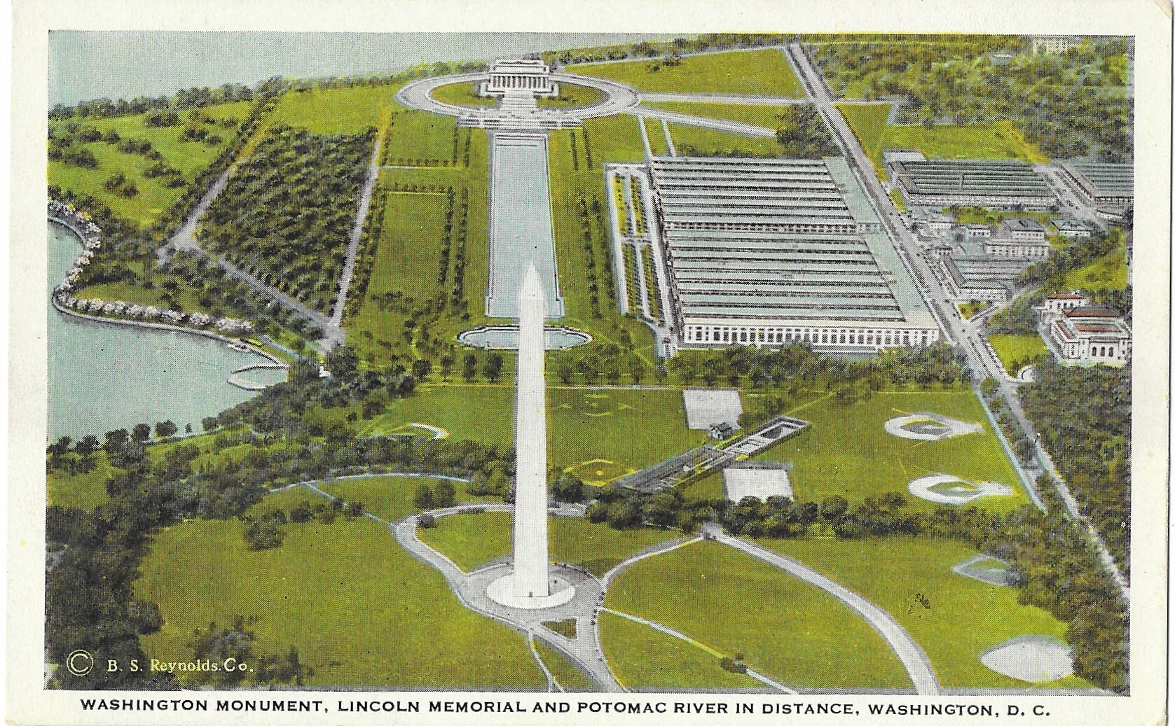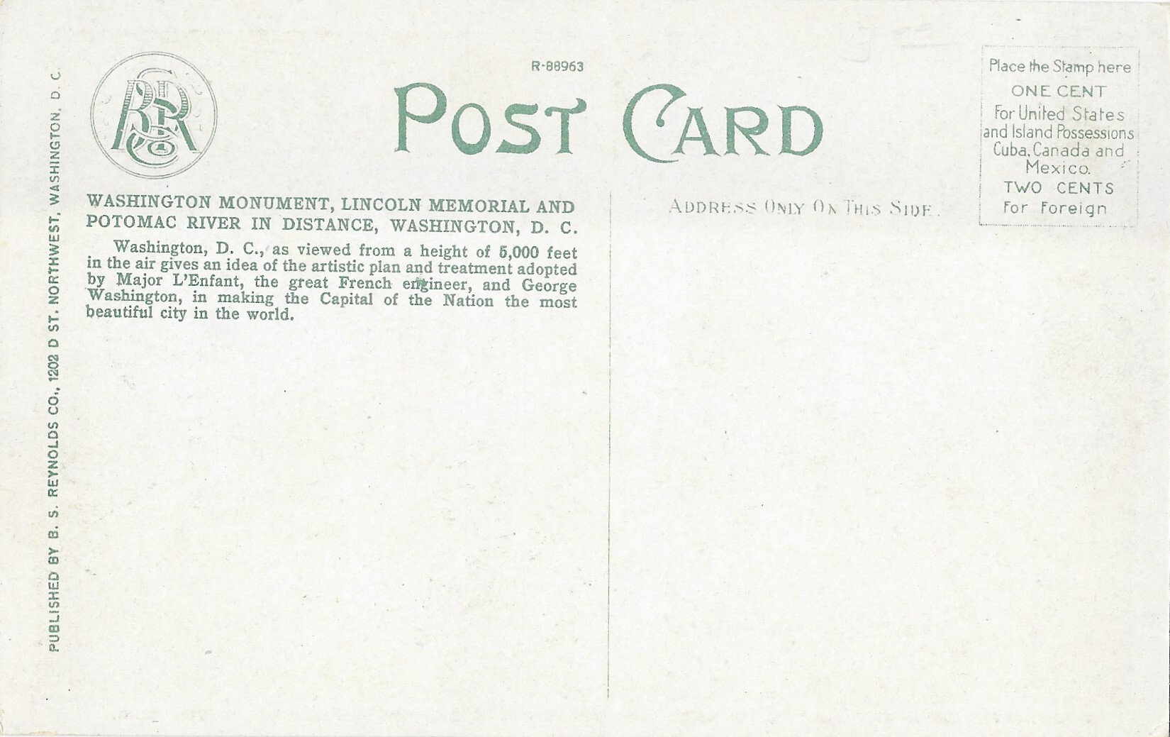 Washington Monument, Lincoln memorial & Potomac River, Washington DC a B S Reynolds Co postcardSeller Information