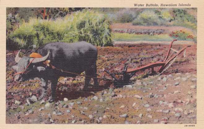 Water Buffalo with Native Plow. Hawaii. Standard sized linen post card. The Curt-Teich Dating Guide assigns 2B-H888 to 1942. Very good condition.