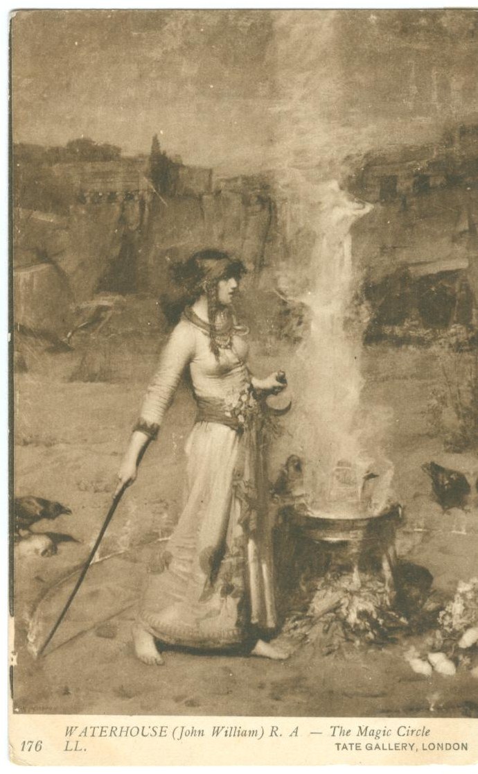 P7745 Waterhouse (John William) The Magic Circle, Le Cercle Magique, early 1900s unused Postcard 13.7x8.6 cm Condition: good, corners slightly worn & creased, stains on backside.