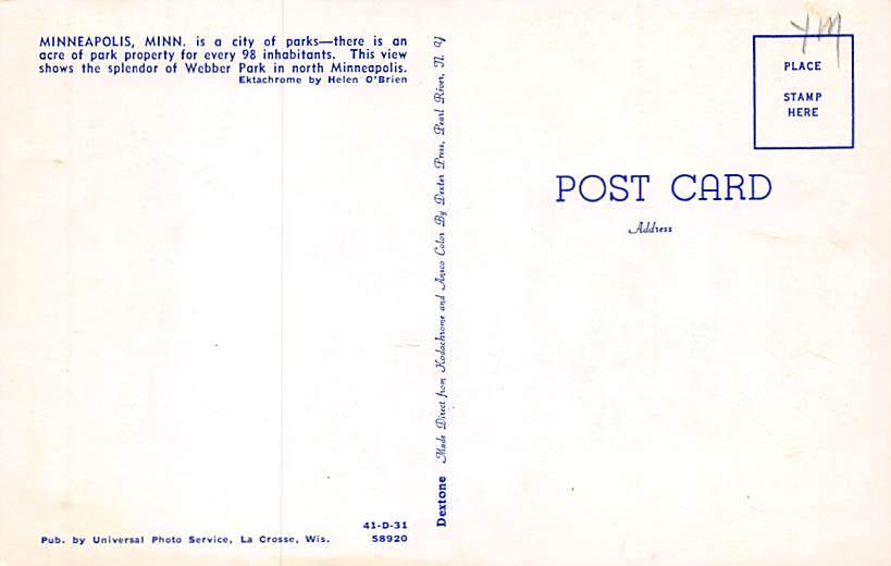 Webber Park Webber Park - Minneapolis, Minnesota MN Postcard Postal Date: Unused Grade: 2 Size: Regular Size Postcard - approximately 3 1/2 inch x 5 1/2 inch (9 CM x 14 CM) Grading Scale: Grade 1 = Perfect co ... Read More