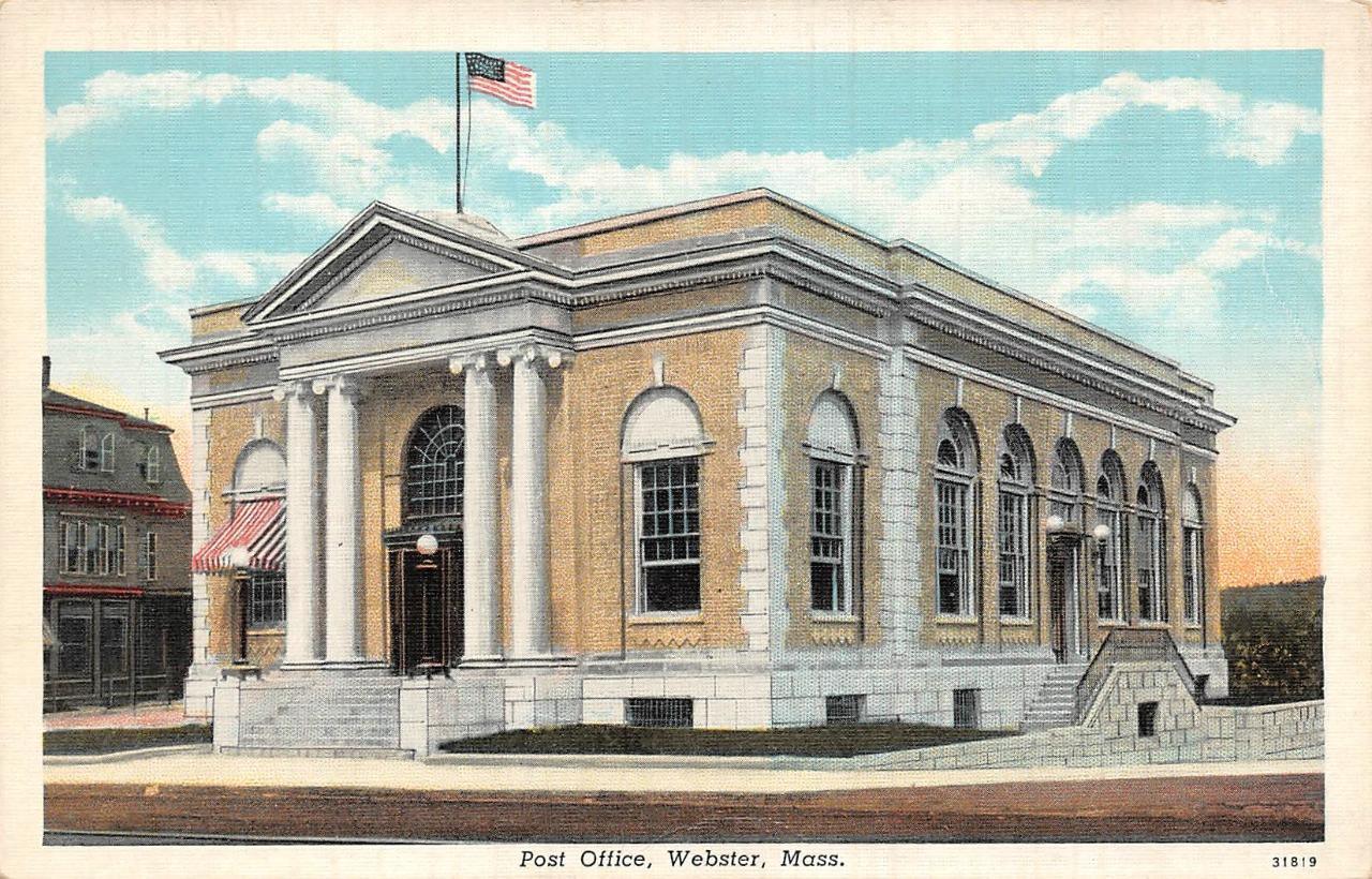 WEBSTER, MA Massachusetts POST OFFICE Worcester County c1940's Linen Postcard WEBSTER, MA Massachusetts POST OFFICE Worcester County c1940's Linen Postcard Click images to enlarge Description Please note that if in the image of the postcard back, an odd colored shadow appears on one side, it is a scanner defect and it does not appear on the card. Item is described as accurately as possible. Please View My Other Items For Sale and be sure to Add me to your Favorite Sellers. Please be sure to Visit My Hip Store, new items are listed every week. Please don't hesitate to send me a question, before or after your purchase. I want to make sure your experience is a positive one, and will respond promptly to all inquiries. I only sell standard size vintage postcards, shipped typically within 24 hours, in a cardboard stiffened envelope. I offer a full refund if you are unhappy with your purchase, so please buy with confidence. Images sell!Get Supersized Images & Free Image HostingCreate your brand with Auctiva'sCustomizable Templates.Attention Sellers - Get TemplatesImage Hosting, Scheduling at Auctiva.com.Track Page Views WithAuctiva's FREE Counter