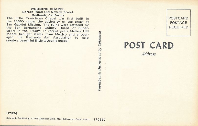 Wedding Chapel - Franciscan Chapel. Red Lands, California. Standard sized chrome card. Distributed by Columbia International of Hollywood. Very good condition.