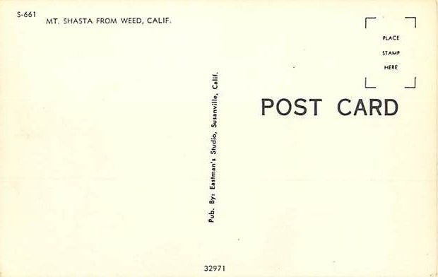 Weed & Mt. Shasta California Ca Type of Postcard: STANDARD SIZE CHROME Postmark: NOT MAILED Condition: VERY GOOD Please note: Shipping to United States via First Class Mail = $1.25 and to worldwide First Cl ... Read More