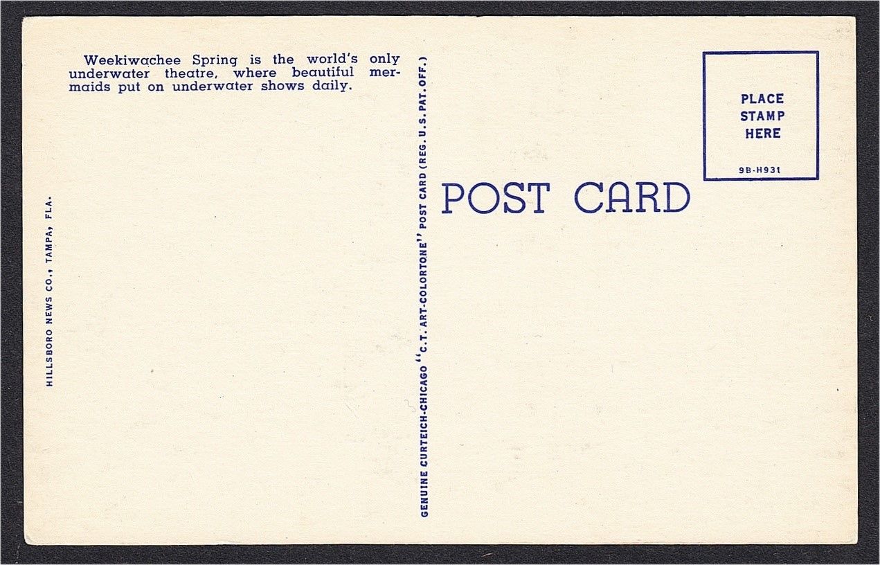 A vintage linen postcard of an underwater mermaid performer with an air hose and fish at Weekiwachee Spring, Florida. It was published by the Hillsboro News Co. of Tampa in 1949. Size: 3½ x 5½ inches (9x14cm) Cond ... Read More