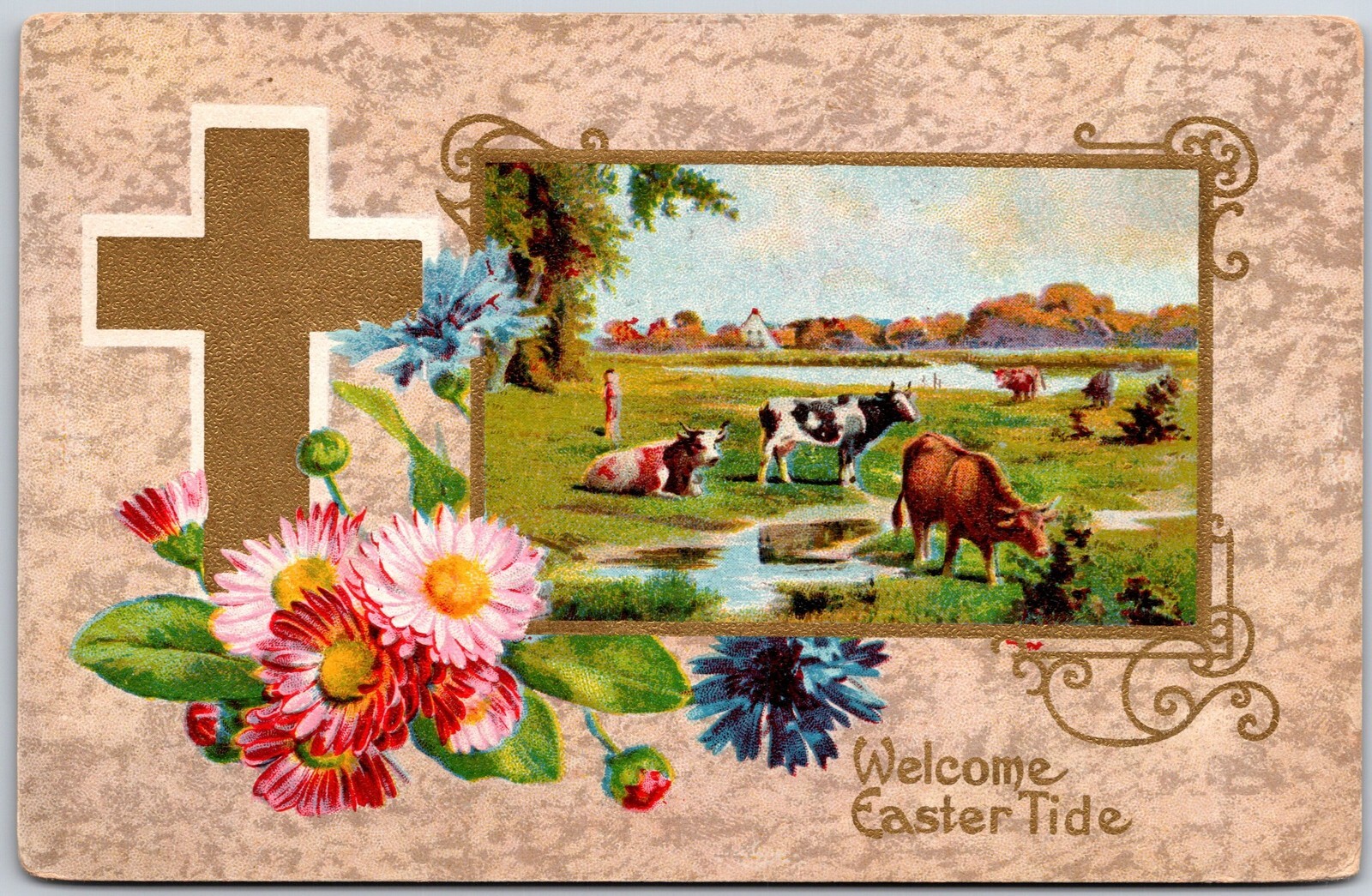 Welcome Easter Tide, Greetings, Cross & Flowers, Cows Farm, Vintage Postcard