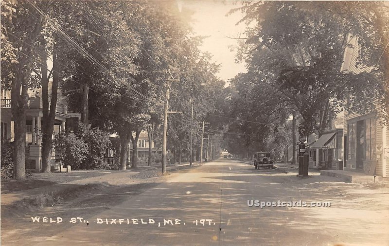 Weld Street in Dixfield, Maine Postcard - Unused Grade: 1 Size: R - Regular size: Approx 3 1/2 X 5 1/2 inch (9 cm X 14 cm) Grading Scale: Grade 1 = Perfect corners Grade 2 = Very Minimal corner wear, no crease ... Read More