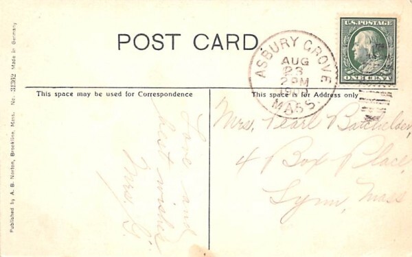 Wenham Lake in Wenham, Massachusetts Postcard - 1909 Grade: 4 Size: R - Regular size: Approx 3 1/2 X 5 1/2 inch (9 cm X 14 cm) Grading Scale: Grade 1 = Perfect corners Grade 2 = Very Minimal corner wear, no cr ... Read More