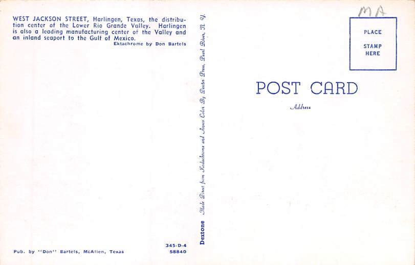 West Jackson Street - Harlingen, Texas TX Postcard - View Images Grade: 1 Size: R - Regular Size Postcard - approximately 3 1/2 inch x 5 1/2 inch (9 CM x 14 CM) Grading Scale: Grade 1 = Perfect corners Grade 2 ... Read More