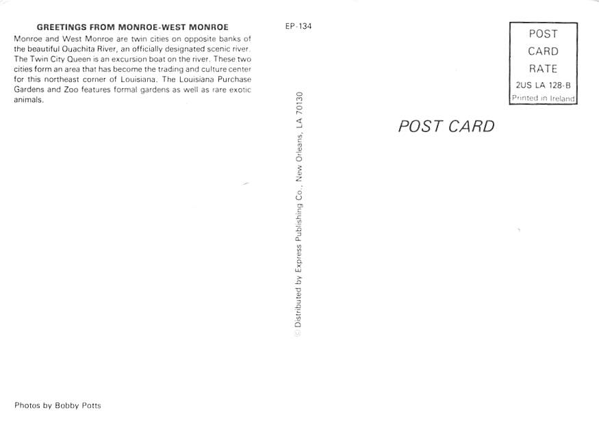 West Monroe City Hall - Louisiana Grade: 1 Category: Continental Size Postcard, Approx 4 in x 6 in (10 cm x 15.25 cm) Product Size: Continental size: 4X6 inches (10.5 cm x 15 cm) Grading Scale: Grade 1 = Perfe ... Read More